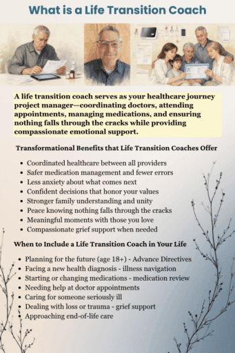 A life transition coach serves as your healthcare journey project manager—coordinating all the moving parts of your care, attending appointments with you, managing your medications safely, and ensuring every step of your treatment plan is completed properly. This hands-on approach helps improve quality of life and may even help extend life by preventing medication errors and ensuring you receive the full benefit of all treatments.