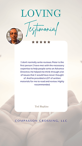 Families and healthcare professionals share their experiences working with Nurse Peter and Compassion Crossing. These stories show how we help people feel more prepared, supported, and peaceful during life’s most challenging moments.